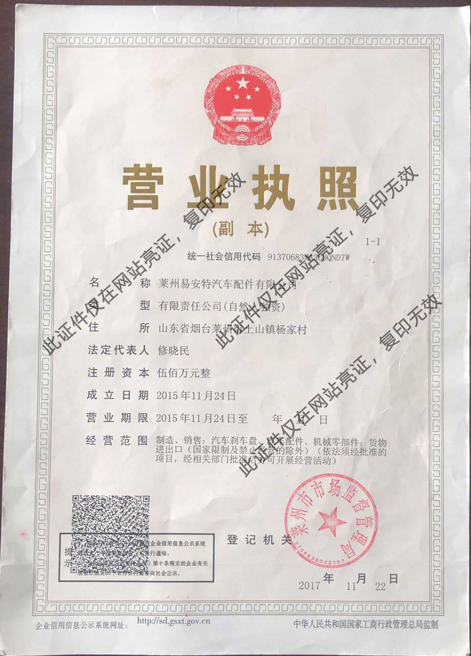 萊州易安特汽車配件有限公司始建于1998年,位于萊州市土山鎮工業園,是生產 剎車盤,剎車鼓,汽車配件的專業廠家,產品遠銷海外及國內各汽車行業,現有職工80余人,其中工程師3名,技術人員10名,鑄造車間,機加工車間各一座,先進的生產線2條,鑄造車間采用先進的熱風爐冶煉,配備有實驗室、化驗室,配備有專業的檢驗人員, 為您提供綠色、環保、安全的剎車盤等汽車配件。 多年來,公司以質量求發展,在行業內贏得了廣泛的好評,廠內抓管理,廠外樹形象,以信譽求發展,這是我們的宗旨。 公司秉承質量為本,服務至上的服務理念,憑借優質的產品和完善的服務歡迎國內外新老客戶隨時來電洽談,愿我們一起攜手共創美好未來。